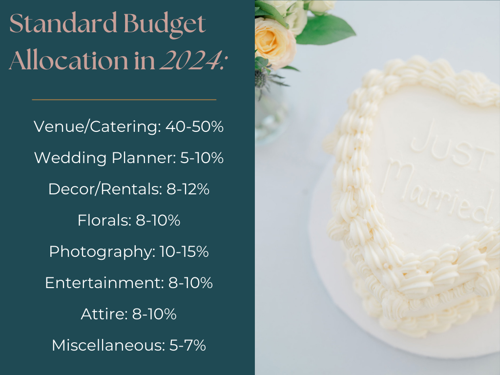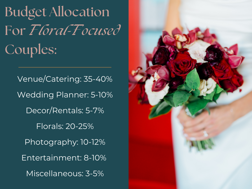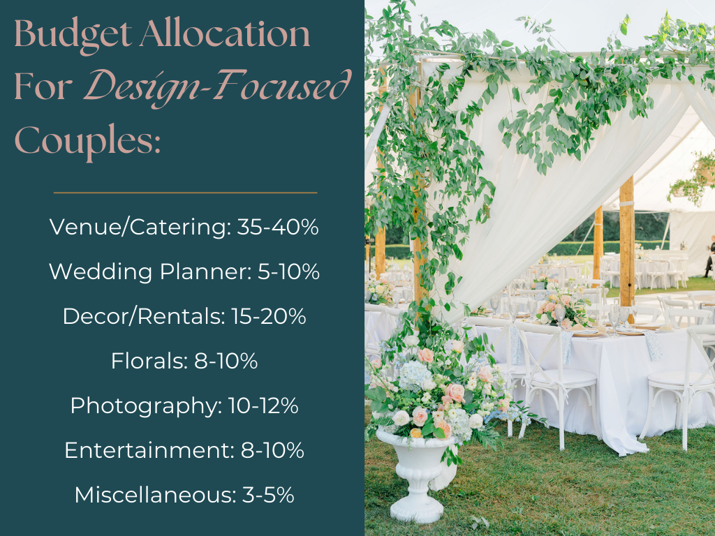 Planning a wedding is one of the most exciting journeys a couple embarks on, but it also comes with its fair share of financial decisions. Allocating your wedding budget isn’t just about crunching numbers; it’s about prioritizing what matters most to you as a couple. While traditional budget guidelines are helpful, each couple’s priorities can influence how funds are distributed. Your wedding should reflect your unique vision and values, and your budget can be tailored to bring those dreams to life. We’ll explore standard wedding budget allocations and how to adjust your wedding budget based on your unique preferences, whether you’re design-focused, food-focused, floral-focused, or simply want it all!